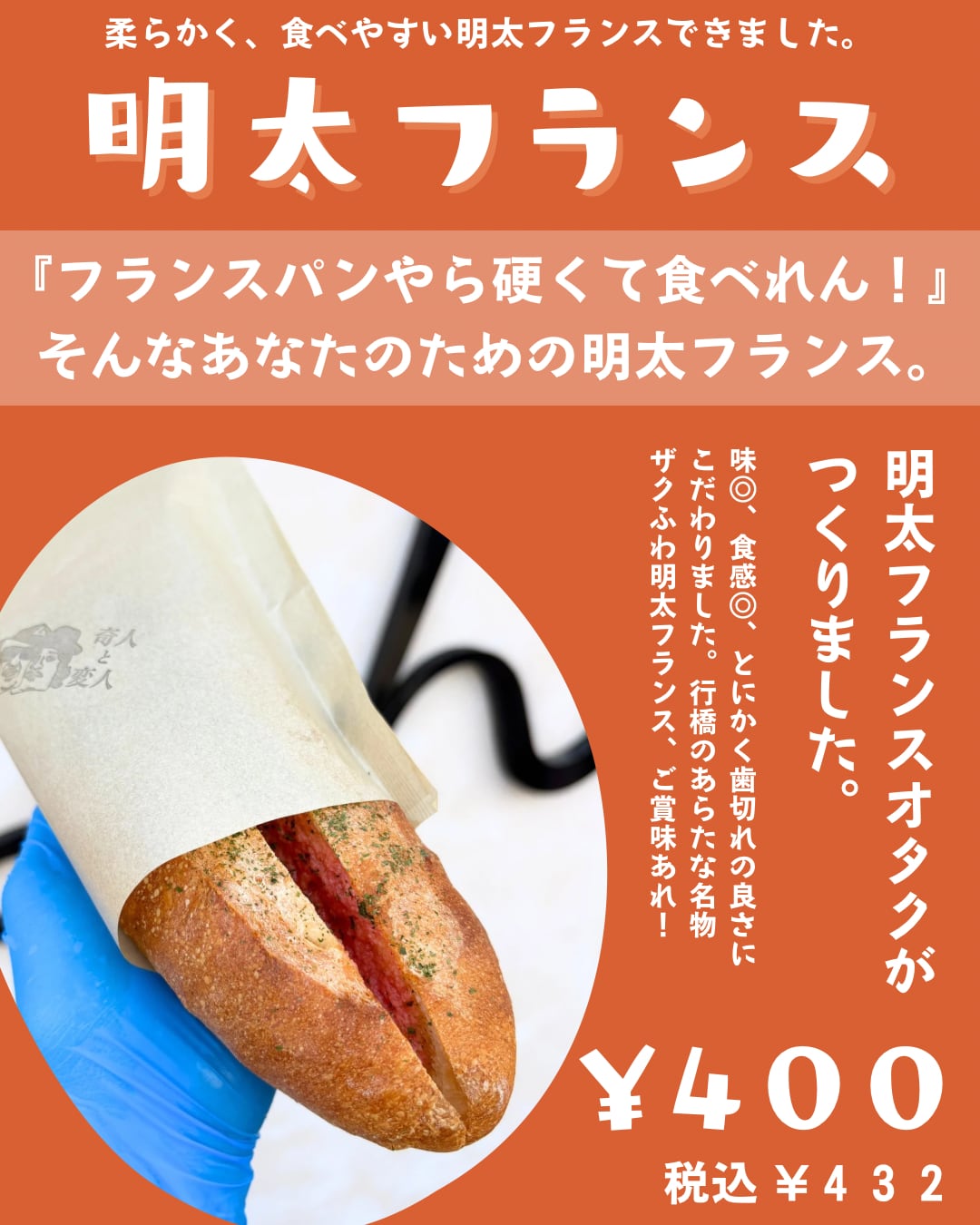 とにかく食感にこだわった、歯切れの良いソフトフランスパンに自家製明太フィリングをたっぷり詰めました!!ザクふわ食感がたまらない自信作です♪